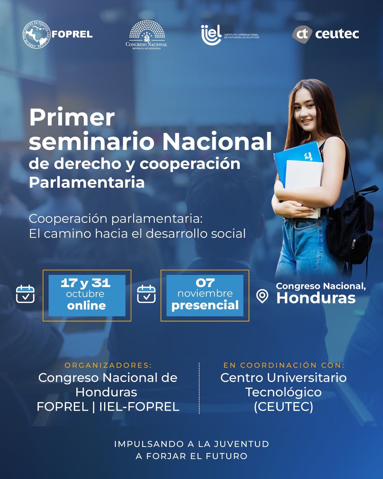 El Congreso Nacional de Honduras, en alianza con el Foro de Presidentes de Poderes Legislativos de Centroamérica y la Cuenca del Caribe (FOPREL) y el Centro Universitario Tecnológico (CEUTEC), anuncian la realización del Primer Seminario Nacional sobre Derecho y Cooperación Parlamentaria, una in...