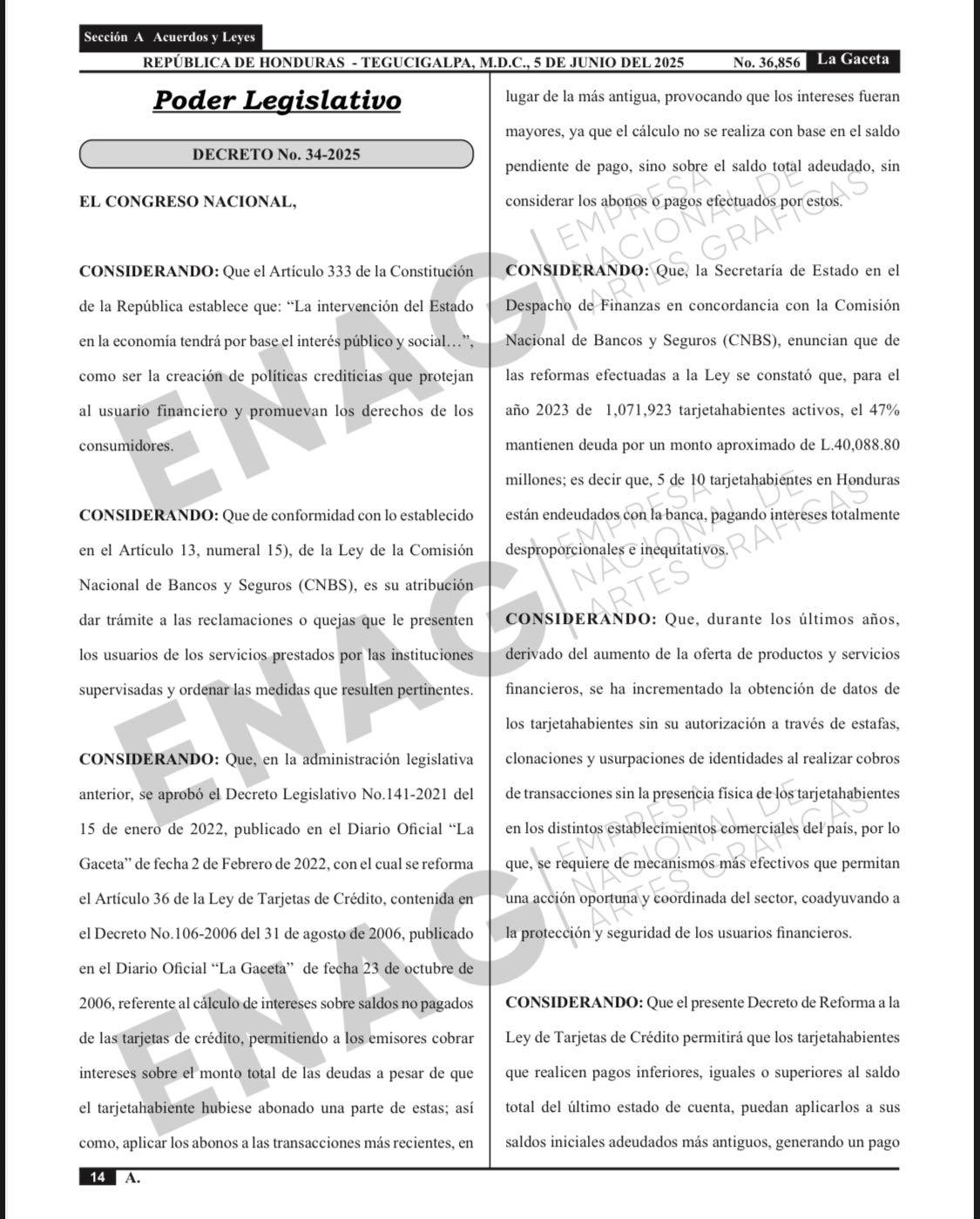 El Congreso Nacional de la República de Honduras presidido por el congresista Luis Redondo, informa a la ciudadanía que ya ha sido publicada en el Diario Oficial La Gaceta la reforma a la Ley de Tarjetas de Crédito, una iniciativa orientada a proteger los derechos de los tarjetahabientes y foment...